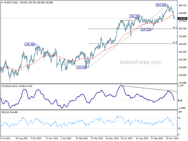 EUR/JPY’s fall from 164.29 is in progress and intraday bias stays on the downside. Sustained break of 161.8% projection of 164.29 to 161.22 from 163.70 at 158.73 will target 154.32 cluster support (38.2% retracement of 139.05 to 164.29 at 154.64). On the upside, above 159.83 minor resistance will turn intraday bias neutral and bring consolidations first.
