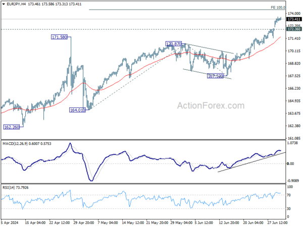 Intraday bias in EUR/JPY remains on the upside. Current up trend should target 100% projection of 164.01 to 170.87 from 167.52 at 174.38. On the downside, below 171.36 minor support will turn intraday bias neutral and bring consolidations first. But outlook will remain bullish as long as 170.87 resistance turned support holds.