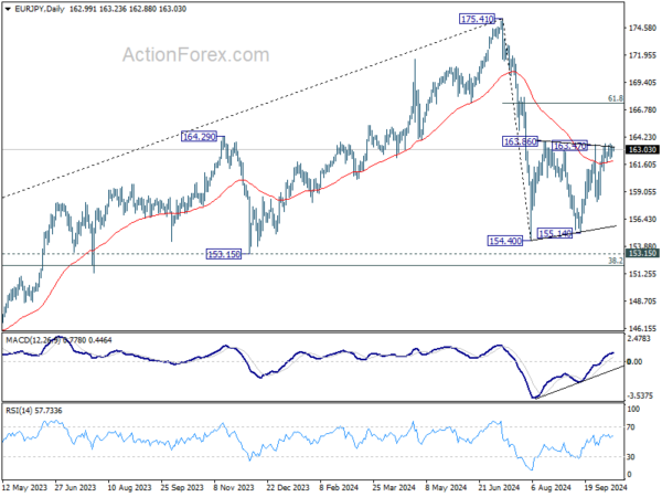 Intraday bias in EUR/JPY remains neutral for the moment. On the upside, firm break of 163.47/86 resistance will resume the rebound from 154.40 to 61.8% retracement of 175.41 to 154.40 at 167.38. On the downside, break of 158.09 will bring deeper fall back to 154.40/155.14 support zone instead.
