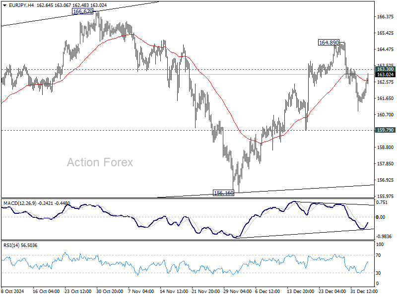 EUR/JPY recovered further today but stays below 163.30 minor resistance and intraday bias stays neutral. Outlook is unchanged that t corrective pattern from 154.40 is still extending. Above 163.30 minor resistance will bring retest of 164.89 first. Break there will target 166.67 resistance next.