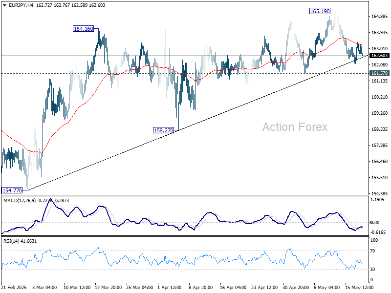Range trading continues in EUR/JPY and intraday bias remains neutral. Further rally is in favor as long as 161.57 support holds. Break of 165.19 will resume the rise from 154.77 to 166.67 resistance. However, firm break of 161.57 will indicate near term reversal, and turn bias back to the downside.