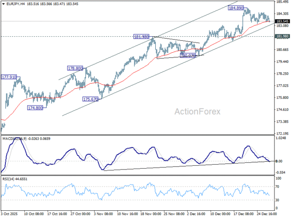 EUR/JPY is staying in consolidations below 184.89 and intraday bias stays neutral for the moment. While deeper retreat cannot be ruled out, downside should be contained above 181.98 resistance turned support to bring another rally. On the upside, break of 184.89 temporary top will resume larger up trend to 186.31 long term projection level.