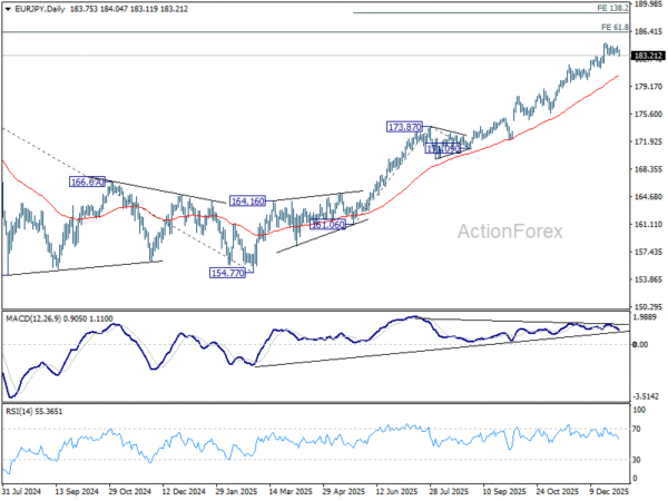 EUR/JPY dips notably today but stays well above 181.98 resistance turned support. Intraday bias stays neutral and further rally is still expected. On the upside, firm break of 184.89 will resume larger up trend to 186.31 long term projection level.