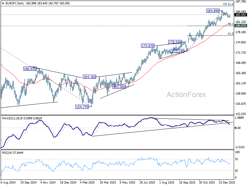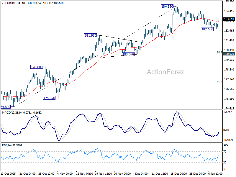 Intraday bias in EUR/JPY is turned neutral with current recovery. Price action from 184.89 is seen as a corrective pattern. Below 182.60 will target 55 D EMA (now at 180.82) and below . But strong support should emerge from 180.07 cluster (38.2% retracement of 172.24 to 184.89 at 180.05) to bring rebound. On the upside, firm break of 184.89 will resume larger up trend to 186.31 fibonacci level.