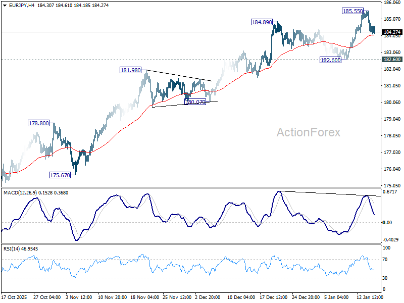Intraday bias in EUR/JPY remains neutral and more consolidations could be seen below 185.55 temporary top. Further rally is expected with 182.60 support intact. Above 185.55 will resume larger up trend to is 186.31 fibonacci level. Firm break there will pave the way to 138.2% projection of 151.06 to 173.87 from 172.24 at 189.94. However, considering bearish divergence condition in 4H MACD, firm break of 182.60 will confirm short term topping, and turn bias back to the downside for deeper pullback.