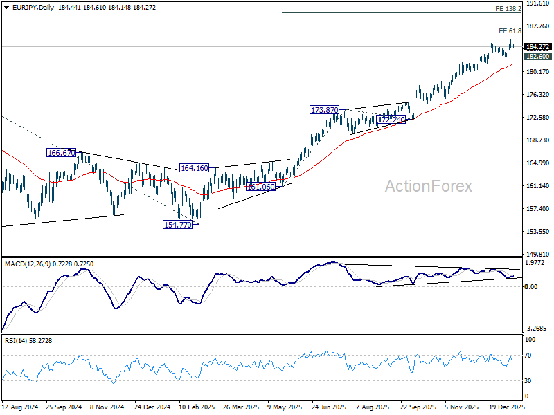 In the bigger picture, up trend from 114.42 (2020 low) is in progress and should target 61.8% projection of 124.37 (2021 low) to 175.41 (2024 high) from 154.77 (2025 low) at 186.31. Firm break there will target 78.6% projection at 194.88. Outlook will remain bullish as long as 175.41 resistance turned support holds, even in case of deep pullback.