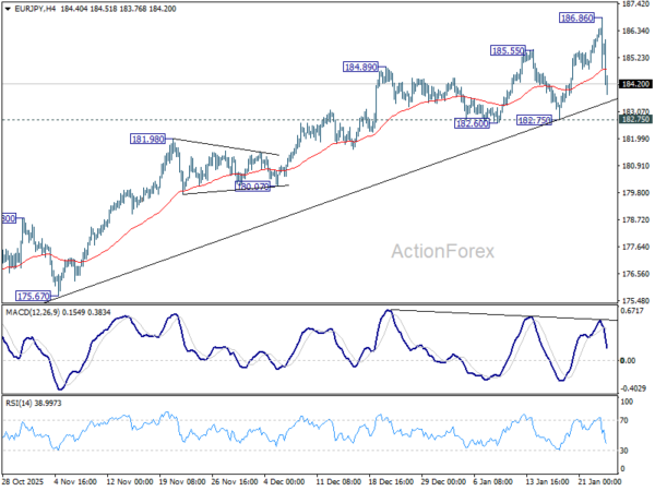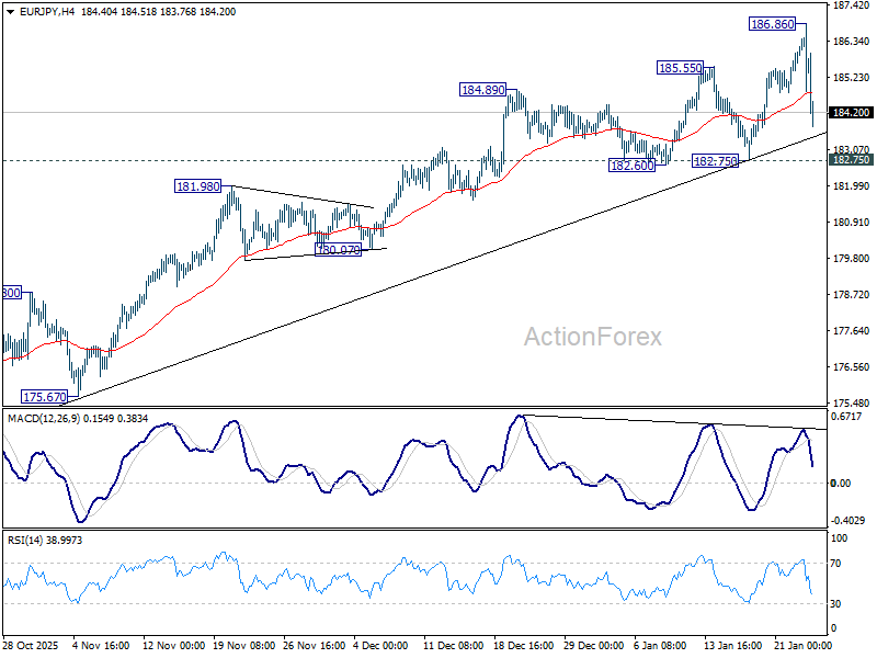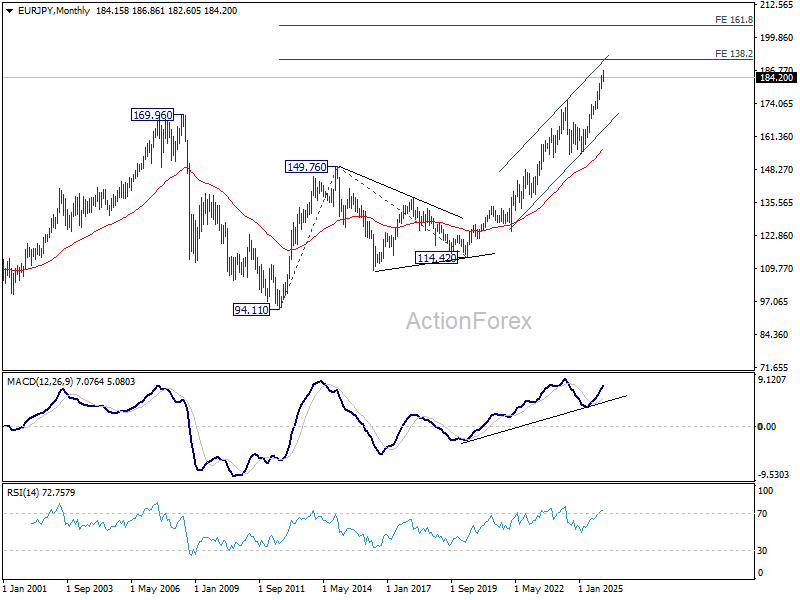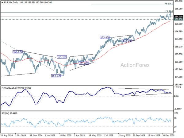 EUR/JPY spiked higher to 186.86 last week but quickly retreated after meeting 186.31 projection level. Initial bias remains neutral this week first. As long as 182.75 support holds, further rally is in favor. Firm break of 186.86 will target 138.2% projection of 151.06 to 173.87 from 172.24 at 189.94. However, considering bearish divergence condition in D MACD, decisive break of 182.75 should indicate medium term topping and bring larger scale correction.