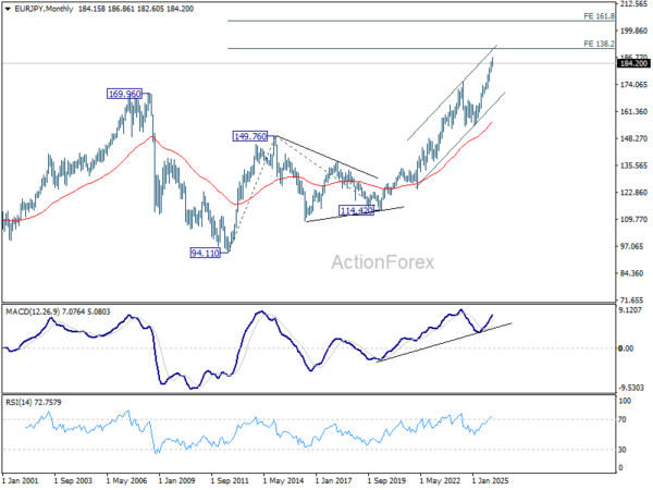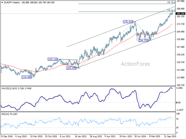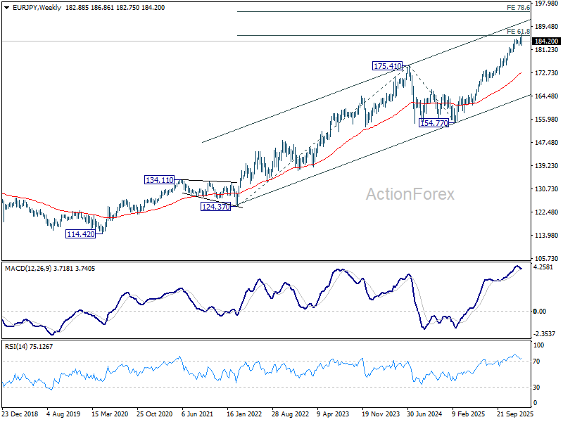 In the bigger picture, up trend from 114.42 (2020 low) is in progress and and met 61.8% projection of 124.37 to 175.41 from 154.77 at 186.31. Considering bearish divergence condition in D MACD, upside could be capped by 186.31 on first attempt. Still, outlook will stay bullish as long as 55 W EMA (now at 172.99) holds, even in case of deep pullback. Sustained break of 186.31 will pave the way to 78.6% projection at 194.88 next.