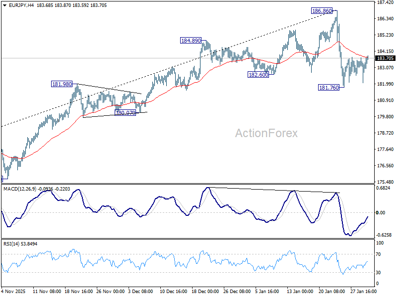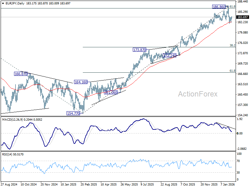 Intraday bias in EUR/JPY remains neutral for the moment. Some consolidations would be seen and risk will stay on the downside as long as 186.86 holds, in case of strong recovery. Break of 181.76 and sustained trading below 55 D EMA (now at 182.28) should solidify the case that fall from 186.86 medium term top is correcting whole rise from 154.77. Deeper decline should then be seen to 38.2% retracement of 154.77 to 186.86 at 174.60.