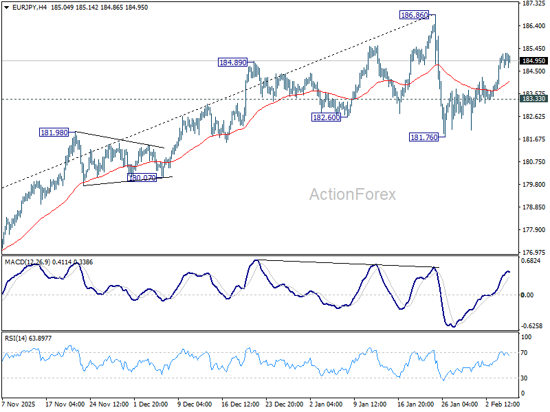 EUR/JPY is staying in range below 186.86 and intraday bias remains neutral. On the downside, below 183.33 will bring retest of 181.76. Sustained trading below 55 D EMA (now at 182.56) should solidify the case that fall from 186.86 medium term top is correcting whole rise from 154.77. Deeper decline should then be seen to 38.2% retracement of 154.77 to 186.86 at 174.60. Nevertheless, firm break of 186.86 will resume larger up trend.