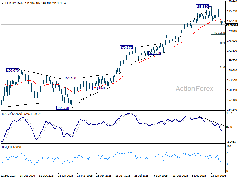 No change in EUR/JPY’s outlook and intraday bias stays neutral. Focus remains on 38.2% retracement of 172.24 to 186.86 at 181.27. On the downside, sustained break of 181.27 will argue that fall from 186.86 is correcting whole up trend from 154.77. Next near term target will be 161.8% projection of 186.86 to 181.76 from 186.22 at 177.96. Nevertheless, strong rebound from current level, followed by break of 182.99 minor resistance will retain near term bullishness, and bring retest of 186.86 high first.