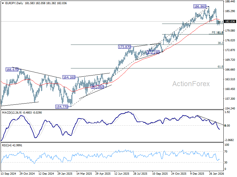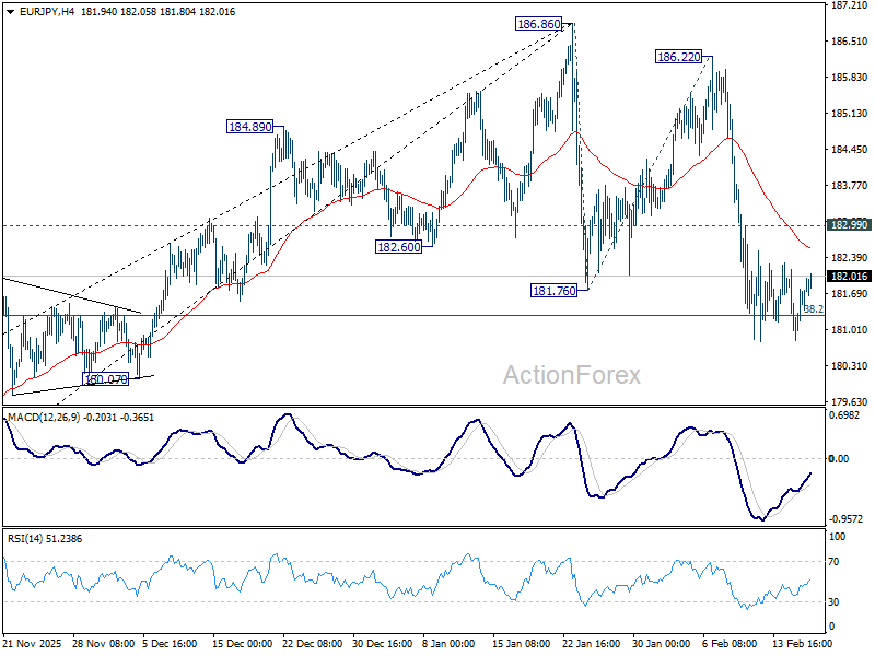 Intraday bias in EUR/JPY remains neutral and outlook is unchanged. Focus remains on 38.2% retracement of 172.24 to 186.86 at 181.27. On the downside, sustained break of 181.27 will argue that fall from 186.86 is correcting whole up trend from 154.77. Next near term target will be 161.8% projection of 186.86 to 181.76 from 186.22 at 177.96. Nevertheless, strong rebound from current level, followed by break of 182.99 minor resistance will retain near term bullishness, and bring retest of 186.86 high first.