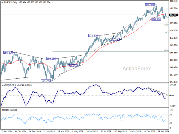 Intraday bias in EUR/JPY remains mildly on the upside for the moment. Corrective fall from 186.86 could have completed after drawing support from 38.2% retracement of 172.24 to 186.86 at 181.27. Further rise should be seen to retest 186.22/186.86 resistance zone first. One the downside, however, sustained break of 181.27 will argue that fall from 186.86 is correcting whole up trend from 154.77.