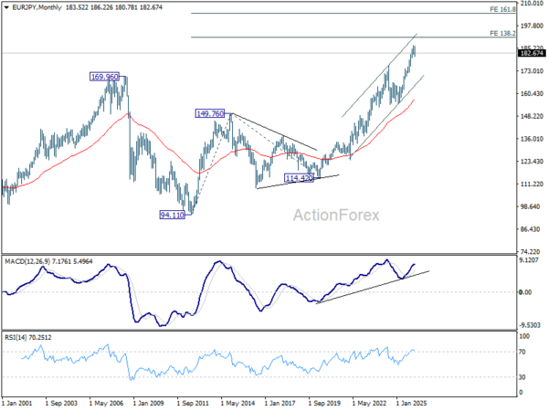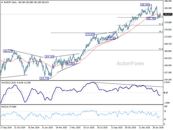 In the bigger picture, considering bearish divergence condition in D MACD and break of 55 D EMA, a medium term top could be formed at 186.86 already. Deeper correction would be seen but downside should be contained by 38.2% retracement of 154.77 to 186.86 at 174.60 to bring rebound. Meanwhile, firm break of 186.86 will resume larger up trend to 78.6% projection of 124.37 to 175.41 from 154.77 at 194.88 next.