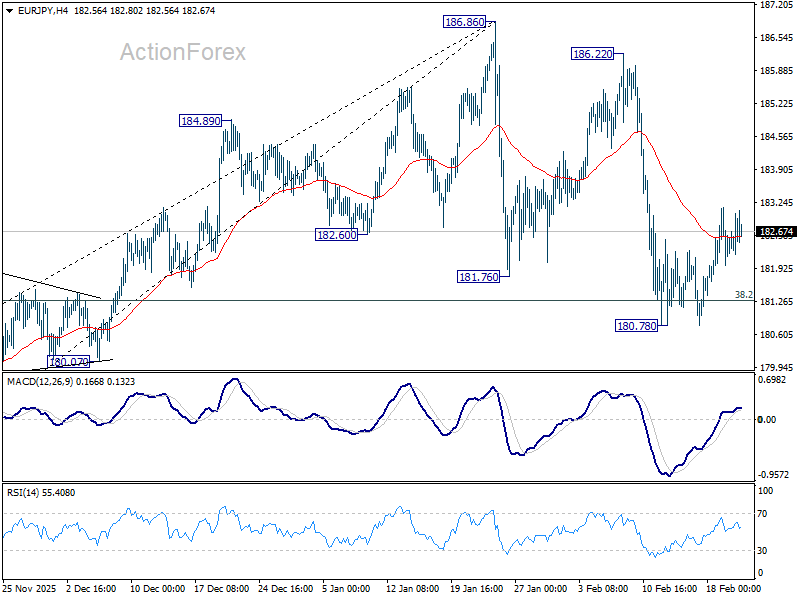 EUR/JPY’s extended rebound last week suggests short term bottoming at 180.78. Fall from 186.86 might have completed after hitting 38.2% retracement of 172.24 to 186.86 at 181.27. Initial bias stays mildly on the upside this week for retesting 186.22/86 resistance zone. However, sustained break of 181.27 will argue that fall from 186.86 is correcting whole up trend from 154.77, and bring deeper decline.