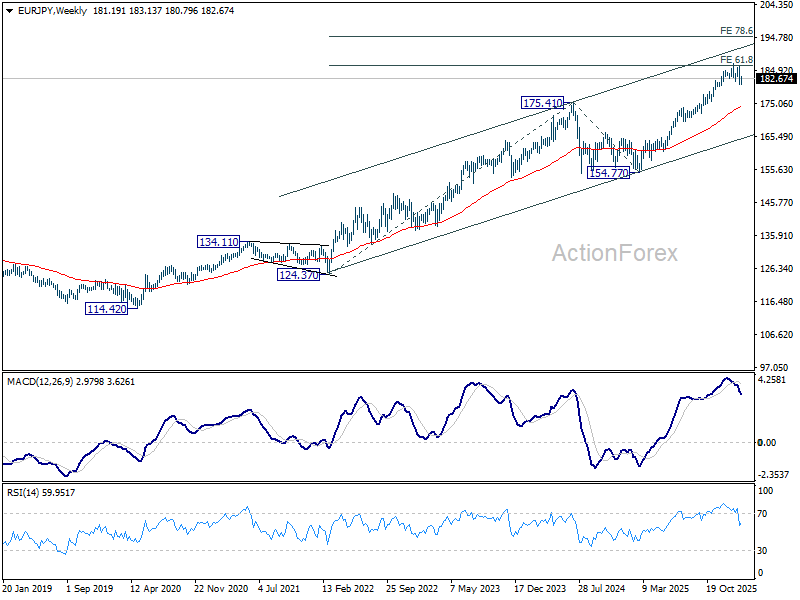 In the bigger picture, considering bearish divergence condition in D MACD and break of 55 D EMA, a medium term top could be formed at 186.86 already. Deeper correction would be seen but downside should be contained by 38.2% retracement of 154.77 to 186.86 at 174.60 to bring rebound. Meanwhile, firm break of 186.86 will resume larger up trend to 78.6% projection of 124.37 to 175.41 from 154.77 at 194.88 next.