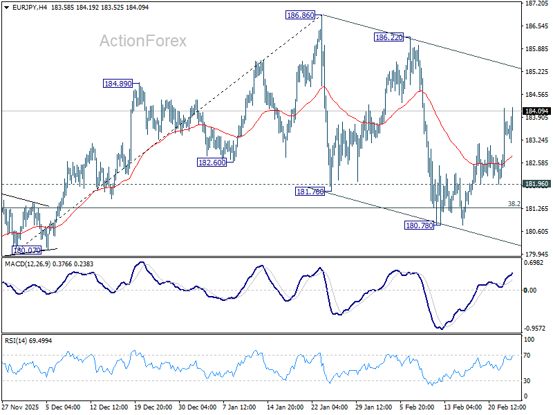 Intraday bias in EUR/JPY stays mildly on the upside for the moment. Near term corrective fall from 187.86 could have completed at 180.78. Further rise should be seen back to retest 186.22/86 resistance zone. On the downside, though, below 181.96 will bring another decline to 38.2% retracement of 172.24 to 186.86 at 181.27.
