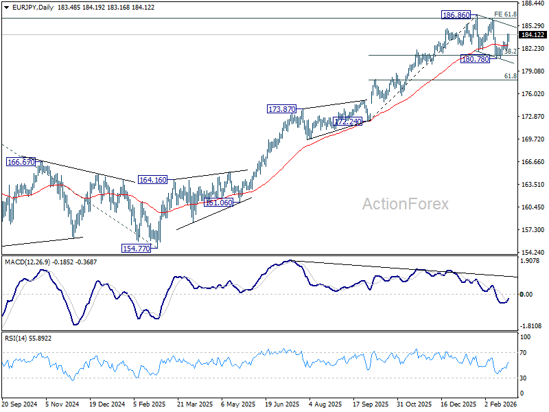 In the bigger picture, current development suggests that price actions from 186.86 are merely a near term corrective pattern. In other words, the long term up trend is still in progress. Firm break of 186.86 will pave the way to 78.6% projection of 124.37 (2022 low) to 175.41 (2025 high) from 154.77 at 194.88 next. This will now remain the favored case as long as 180.78 support holds.