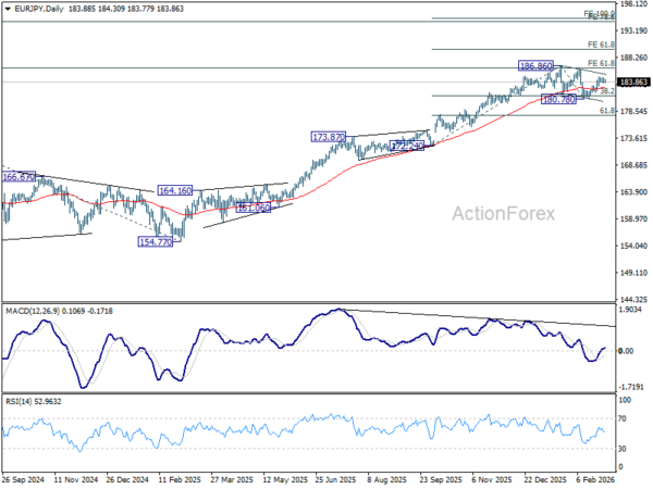 In the bigger picture, current development suggests that price actions from 186.86 are merely a near term corrective pattern. In other words, the long term up trend is still in progress. Firm break of 186.86 will pave the way to 78.6% projection of 124.37 (2022 low) to 175.41 (2025 high) from 154.77 at 194.88 next. This will now remain the favored case as long as 180.78 support holds.