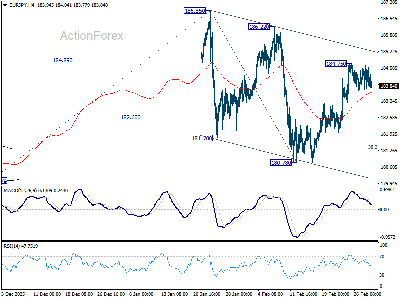 Intraday bias in EUR/JPY remains neutral at this point, as sideway trading continues below 184.75. On the upside, break of 184.75 will target 186.86 high. Firm break there will resume larger up trend to 61.8% projection of 172.24 to 186.86 from 180.78 at 189.81. Overall, outlook will remain bullish as long as 38.2% retracement of 172.24 to 186.86 at 181.27, in case of deep retreat.