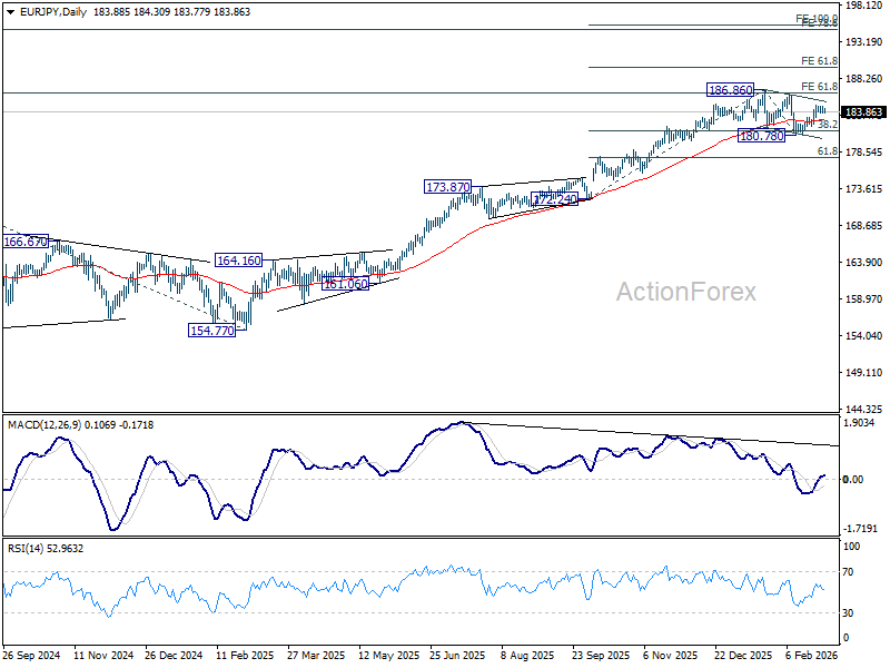 In the bigger picture, current development suggests that price actions from 186.86 are merely a near term corrective pattern. In other words, the long term up trend is still in progress. Firm break of 186.86 will pave the way to 78.6% projection of 124.37 (2022 low) to 175.41 (2025 high) from 154.77 at 194.88 next. This will now remain the favored case as long as 180.78 support holds.