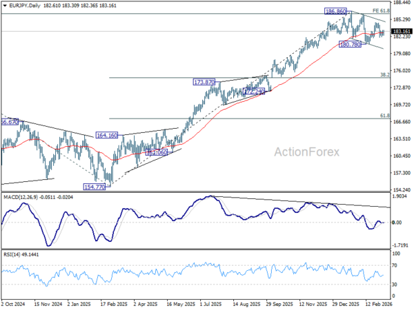 In the bigger picture, a medium term top should be in place at 186.86 and some more consolidations could be seen. Nevertheless, the larger up trend from 114.42 (2020 low) remains intact. Firm break of 186.86 will pave the way to 78.6% projection of 124.37 (2022 low) to 175.41 (2025 high) from 154.77 at 194.88 next.