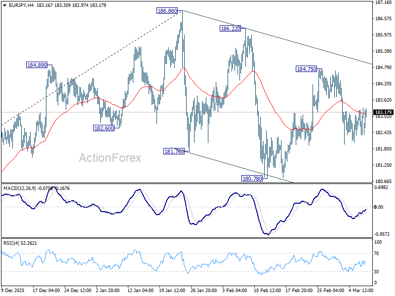 Intraday bias in EUR/JPY remains neutral at this point. On the downside, firm break of 180.78 support will indicate that fall from 186.86 is already correcting whole up rise from 154.77. Deeper fall should then be seen to 38.2% retracement of 154.77 to 186.86 at 174.60. For now, near term outlook is neutral at best as long as 186.86 holds, or until there is sign of upward acceleration.