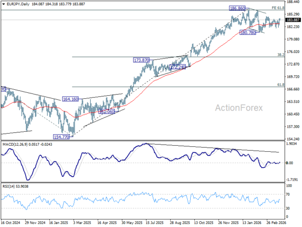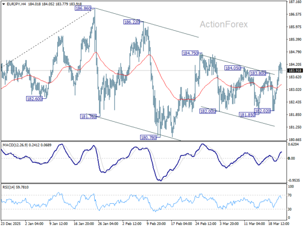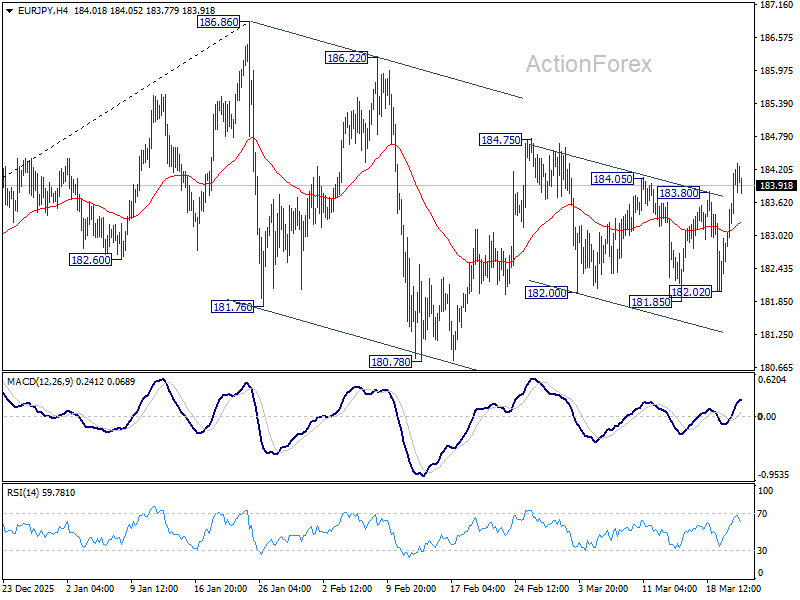 Intraday bias in EUR/JPY stays mildly on the upside from 184.75 resistance. Firm break there will resume the whole rise from 180.78 and target a retest on 186.86 high. For now, risk will stay mildly on the upside a long as 182.02 support holds, in case of retreat.