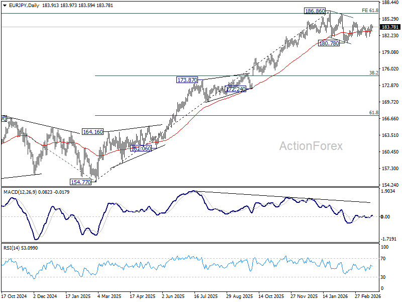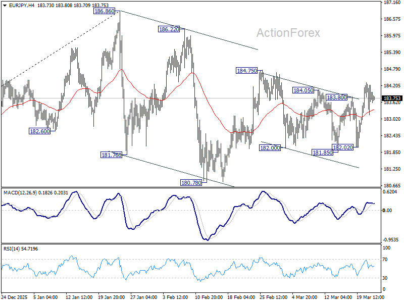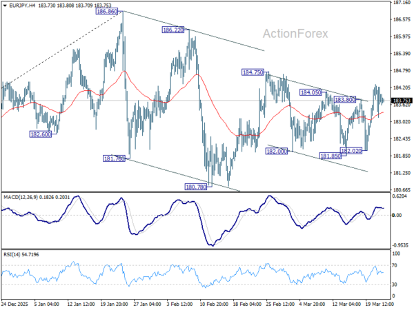Intraday bias in EUR/JPY remains mildly on the upside for 184.75 resistance. Firm break there will resume the whole rise from 180.78 and target a retest on 186.86 high. For now, risk will stay mildly on the upside a long as 182.02 support holds, in case of retreat.