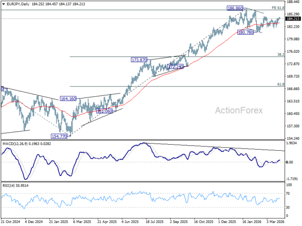 In the bigger picture, a medium term top could be in place at 186.86 and some more consolidations would be seen. Nevertheless, as long as 55 W EMA (now at 175.61) holds, the larger up trend from 114.42 (2020 low) remains intact. Firm break of 186.86 will pave the way to 78.6% projection of 124.37 (2022 low) to 175.41 (2025 high) from 154.77 at 194.88 next.