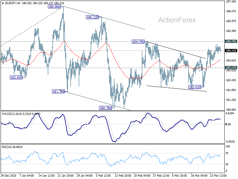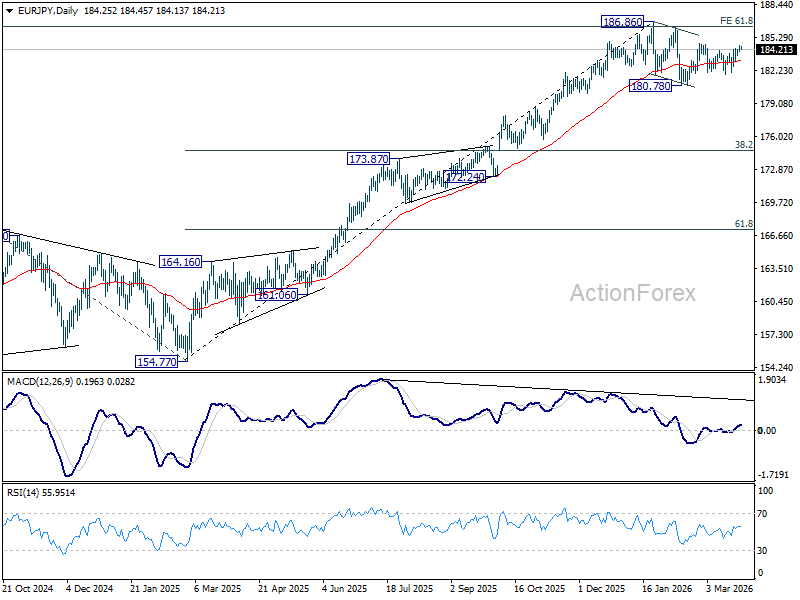 Intraday bias in EUR/JPY remains mildly on the upside. Firm break of 184.75 resistance will resume the whole rise from 180.78 and target a retest on 186.86 high. On the downside, below 183.17 minor support will turn intraday bias neutral first. Further break of 182.02 will bring deeper fall back to 180.78 support.