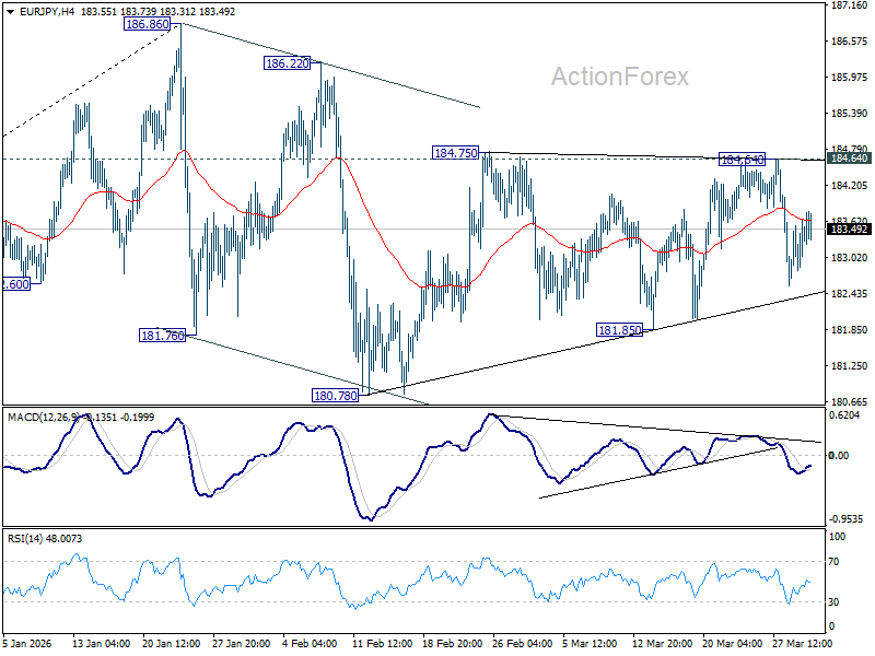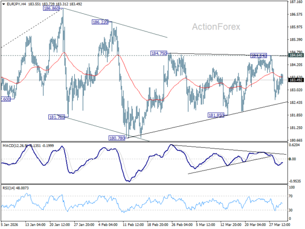 Intraday bias in EUR/JPY is turned neutral again with current recovery. On the downside, firm break of 181.85 support should confirm that the correction from 186.86 is already in the third leg. Deeper fall should be seen to 180.78 and below. For now, risk will stay on the downside as long as 184.86 resistance holds.