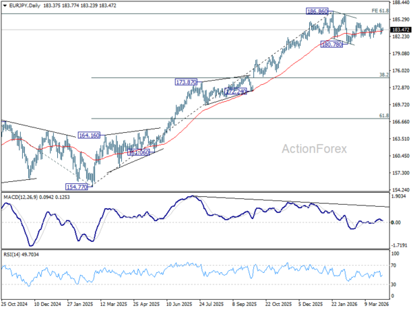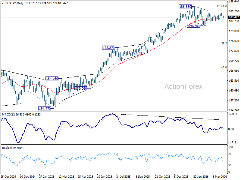 In the bigger picture, a medium term top could be in place at 186.86 and some more consolidations would be seen. Nevertheless, as long as 55 W EMA (now at 175.93) holds, the larger up trend from 114.42 (2020 low) remains intact. Firm break of 186.86 will pave the way to 78.6% projection of 124.37 (2022 low) to 175.41 (2025 high) from 154.77 at 194.88 next.