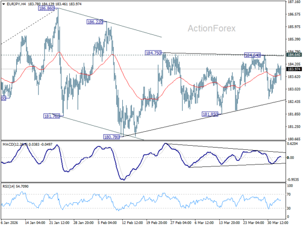 Intraday bias in EUR/JPY stays neutral as sideway trading continues. On the downside, firm break of 181.85 support should confirm that the correction from 186.86 is already in the third leg. Deeper fall should be seen to 180.78 and below. For now, risk will stay on the downside as long as 184.86 resistance holds.