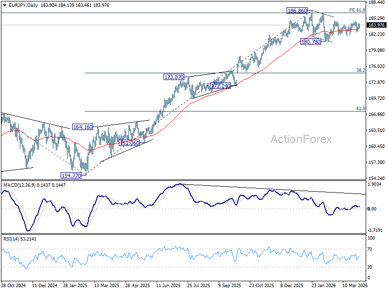 In the bigger picture, a medium term top could be in place at 186.86 and some more consolidations would be seen. Nevertheless, as long as 55 W EMA (now at 175.93) holds, the larger up trend from 114.42 (2020 low) remains intact. Firm break of 186.86 will pave the way to 78.6% projection of 124.37 (2022 low) to 175.41 (2025 high) from 154.77 at 194.88 next.