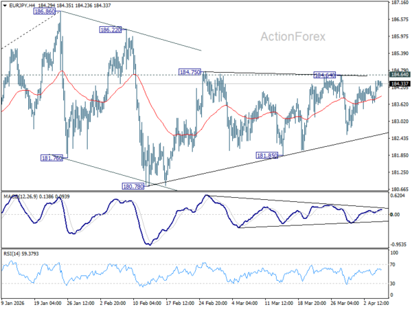Intraday bias in EUR/JPY remains neutral for the moment. On the downside, firm break of 181.85 support should confirm that the correction from 186.86 is already in the third leg. Deeper fall should be seen to 180.78 and below. However, break of 184.75 resistance will bring stronger rally to retest 186.86 high instead.