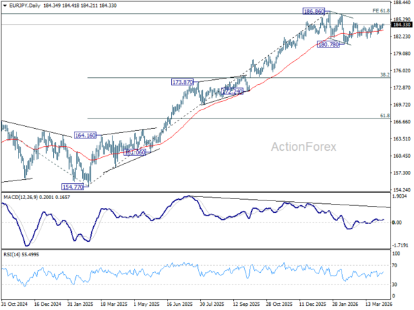 In the bigger picture, a medium term top could be in place at 186.86 and some more consolidations would be seen. Nevertheless, as long as 55 W EMA (now at 176.21) holds, the larger up trend from 114.42 (2020 low) remains intact. Firm break of 186.86 will pave the way to 78.6% projection of 124.37 (2022 low) to 175.41 (2025 high) from 154.77 at 194.88 next.