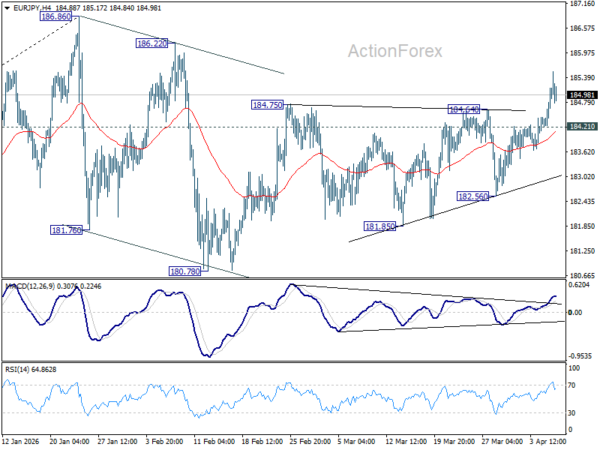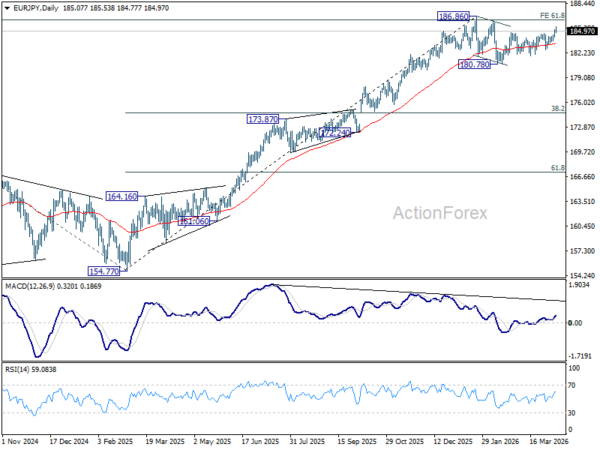 EUR/JPY’s rise from 180.78 resumed by breaking through 184.75 resistance and intraday bias is back on the upside. Further rally should be seen to retest 186.86 high. On the downside, below 184.21 minor support will turn intraday bias neutral first. Further break of 182.56 will extend the corrective pattern from 186.86 with another falling leg.