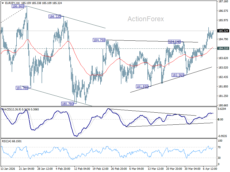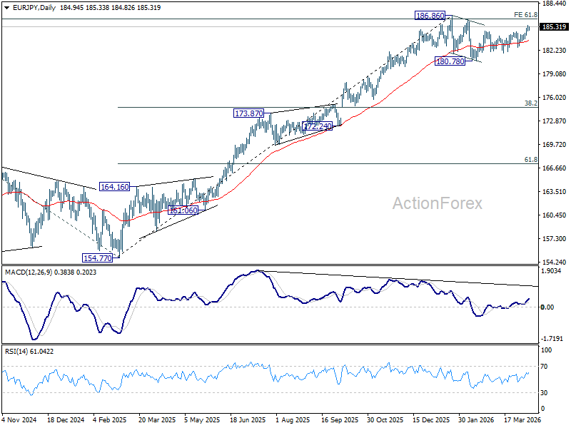 Intraday bias in EUR/JPY remains mildly on the upside for the moment. Rise from 180.78 is in progress and should target a retest on 186.86 high. On the downside, below 184.21 minor support will turn intraday bias neutral first. Further break of 182.56 will extend the corrective pattern from 186.86 with another falling leg.