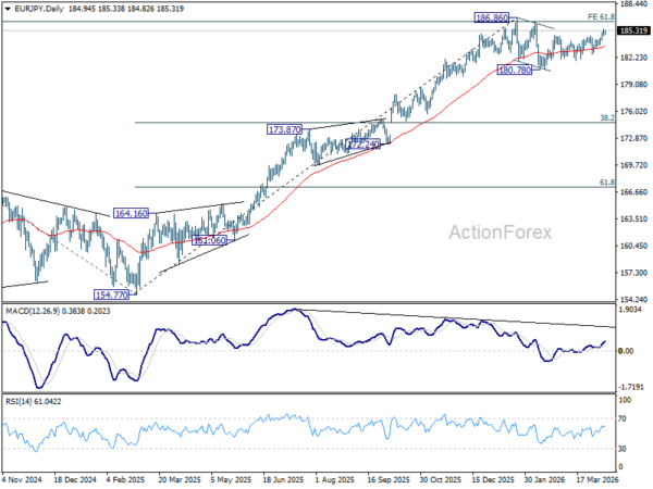 In the bigger picture, a medium term top could be in place at 186.86 and some more consolidations would be seen. Nevertheless, as long as 55 W EMA (now at 176.21) holds, the larger up trend from 114.42 (2020 low) remains intact. Firm break of 186.86 will pave the way to 78.6% projection of 124.37 (2022 low) to 175.41 (2025 high) from 154.77 at 194.88 next.