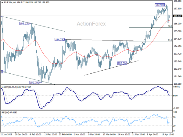 Intraday bias in EUR/JPY is turned neutral with current recovery. But more consolidations could be seen below 187.93 short term top. Another fall might be seen to 38.2% retracement of 182.56 to 187.93 at 185.87. On the upside, though, break of 187.93 will resume larger up trend.