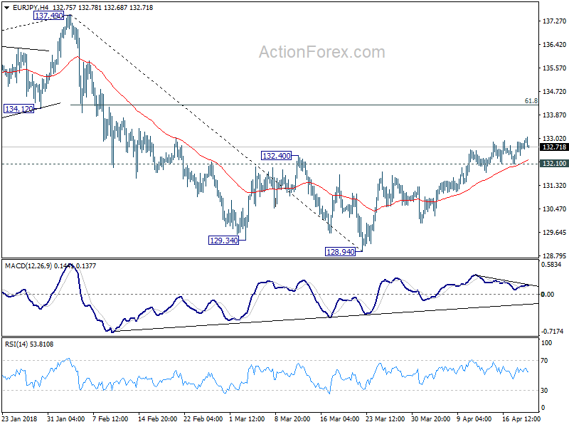 EUR/JPY’s rise continue with weak upside momentum as seen in 4 hour MACD. While further rebound could be seen, upside will now likely be limited by 61.8% retracement of 137.49 to 128.94 at 134.22 and below. On the downside, below 132.10 minor support will suggests that the rebound from 128.94 might have completed. And, intraday bias will be turned back to the downside for retesting 128.94 low.