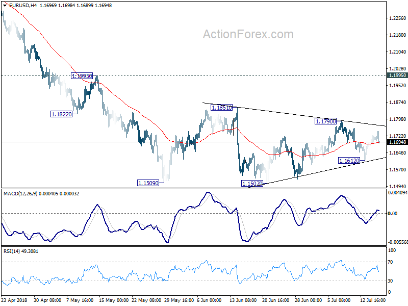 Intraday bias in EUR/USD is turned neutral again as it lost upside moment. Outlook is unchanged though as consolidation from 1.1507 might extend. In case of another rise, upside should be limited by 1.1851 resistance to bring fall resumption eventually. On the downside, below 1.1612 will bring retest of 1.1507 low first. Decisive break there will resume larger fall from 1.2555. In that case, EUR/USD should drop through 50% retracement of 1.0339 to 1.2555 at 1.1447 to 61.8% retracement at 1.1186.