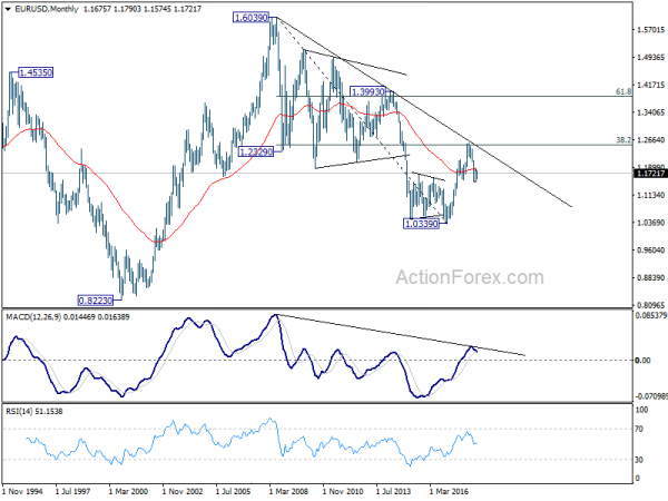 In the long term picture, the rejection from 38.2% retracement of 1.6039 to 1.0339 at 1.2516 argues that long term down trend from 1.6039 (2008 high) might not be over yet. EUR/USD is also held below decade long trend line resistance. Focus will now turn to 1.1553 support. Sustained break there would raise the chance of retesting 1.0339 low. It’s early to tell, but the chance of long term bullish reversal is fading.