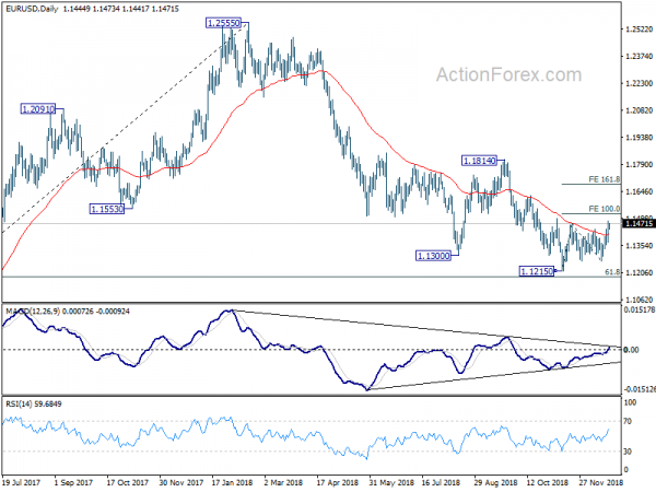Intraday bias in EUR/USD remains on the upside. Current rise from 1.1215 would target 100% projection of 1.1215 to 1.1472 from 1.1270 at 1.1527 first. Break will target 161.8% projection at 1.1686 next. On the downside, however, break of 1.1364 minor support will suggest that the rebound is completed and turn bias back to the downside for 1.1215 low.