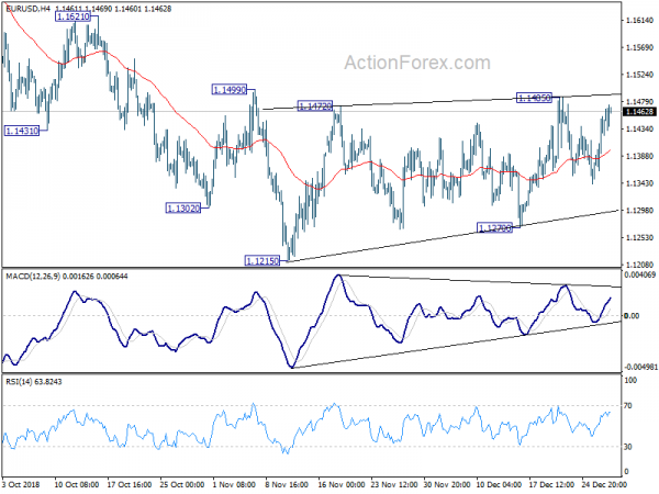 Despite today’s rebound, EUR/USD is staying below 1.1485 resistance. Intraday bias remains neutral first. On the upside, break of 1.1485 resistance will revive the case of near term reversal, on bullish convergence condition in daily MACD. Bias will be turned back to the upside for 1.1621 resistance first. Break will target 1.1814 key resistance next. On the downside, break of 1.1270 will, instead, revive the bearish case that down trend from 1.2555 is still in progress. Bias will be turned back to the downside for 1.1186 key fibonacci level.
