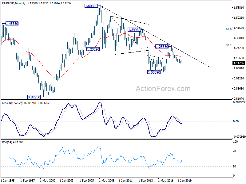 In the long term picture, outlook remains bearish for now. EUR/USD is held below decade long trend line that started from 1.6039 (2008 high). It was also rejected by 38.2% retracement of 1.6039 to 1.0339 at 1.2516 before. A break of 1.0039 low will remain in favor as long as 55 month EMA (now at 1.1658) holds).
