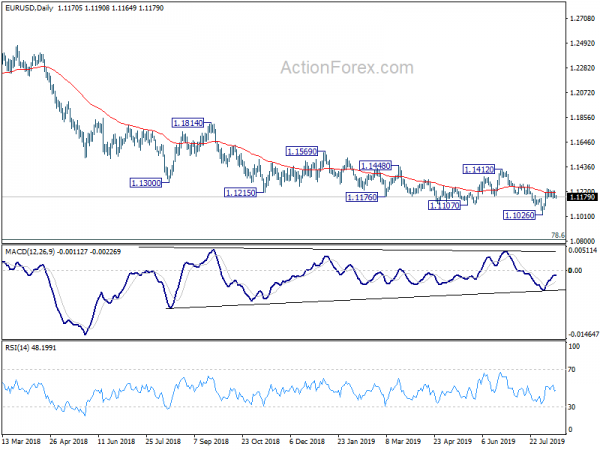 In the bigger picture, current development suggests that down trend from 1.2555 (2018) is in progress and extending. Prior rejection of 55 week EMA also maintained bearishness. Further fall should be seen to 78.6% retracement of 1.0339 to 1.2555 at 1.0813. Decisive break there will target 1.0339 (2017 low). On the upside, break of 1.1412 resistance is needed to indicate medium term bottoming. Otherwise, outlook will stay bearish in case of rebound.