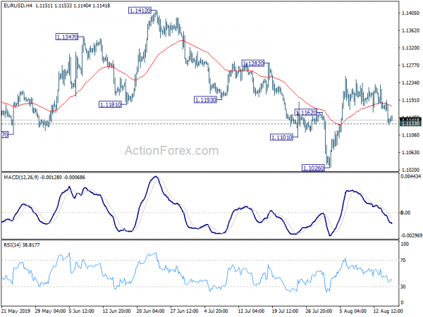 In the bigger picture, current development suggests that down trend from 1.2555 (2018) is in progress and extending. Prior rejection of 55 week EMA also maintained bearishness. Further fall should be seen to 78.6% retracement of 1.0339 to 1.2555 at 1.0813. Decisive break there will target 1.0339 (2017 low). On the upside, break of 1.1412 resistance is needed to indicate medium term bottoming. Otherwise, outlook will stay bearish in case of rebound.