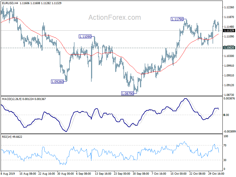 EUR/USD drops notably in early US session but stays above 1.1062 minor support. Intraday bias remains neutral first and another rise is still in favor. On the upside break of 1.1179 will resume the rebound from 1.0879 to 1.1412 key resistance. However, break of 1.1062 will argue that rebound from 1.0879 has completed. Intraday bias will be turned back to the downside for retesting 1.0879.